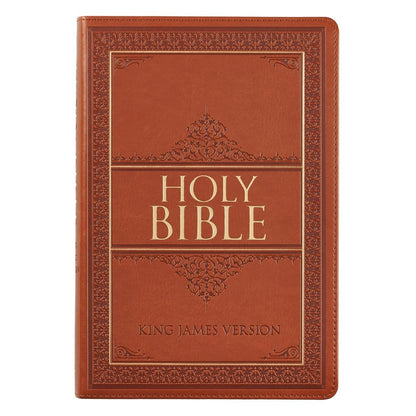 The stunning design of the Saddle Tan Faux Leather Large Print Thinline King James Version Bible with Thumb Index will be appreciated for generations to come. An intricate heat-debossed double border with a gold-foiled inner edge frames the cover of the Classic King James Version Bible. The gold-foiled title is set in the middle of the design, boxed in by two gold-foiled borders with elaborate heat-debossed filigree designs. The version imprint is heat-debossed at the bottom of the design. HOLY BIBLE The spine features the heat-debossed title and version imprint, while the decorative borders and gold foil used on the front cover are repeated on the back cover. The Bible features several luxury design features that include thumb indexing tabs for easy navigation, golden gilt-edged pages, and a matching tan satin ribbon page marker that helps to keep your place. The saddle tan cover is soft and flexible. With its reader-friendly subheadings, the text is organized and easy to read. For added convenience, the words of Christ are printed in red to highlight them. The double-column format makes great use of the space. The Bible also has 8 full-color maps, which makes it easy to visualize historical events. A thematic Scripture verse finder and a one-year Bible reading plan are two practical additions to help you study the text and stay on track with Bible reading. The 10-point type is larger than the standard print found in most Bibles, and the thin silhouette makes it easy to place the Bible in a bag or backpack. The lay-flat binding of the faux leather cover allows your Bible to fall open effortlessly without damage to the spine. This handsomely designed Saddle Tan Faux Leather Large Print Thinline King James Version Bible with Thumb Index can be given as a meaningful gift for a loved one. Consider this Bible as a Father's Day or birthday gift for a husband or father.