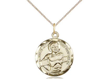 The Saint Dismas Pendant is a beautifully crafted piece of jewelry, made from 14kt gold, featuring a detailed representation of the "Good Thief" with a height of 7/8-inch and width of 3/4-inch. It comes with an 18-inch gold-filled light curb chain, secured with a lobster claw clasp, offering both elegance and spiritual significance. This pendant makes a meaningful and stylish accessory for daily wear or special occasions.