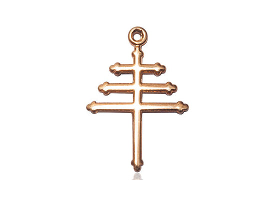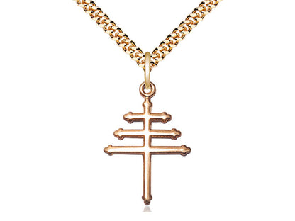 This 14kt Gold Filled Maronite Cross Pendant is a timeless symbol of faith and devotion. Measuring 7/8-inch tall by 5/8-inch wide, it hangs on a 24-inch gold-plated heavy curb chain for a bold yet elegant look. Perfect for daily wear or as a cherished gift, it embodies strength and tradition
