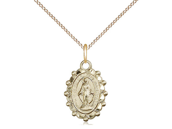 This elegant 14kt Gold Filled Miraculous Pendant on an 18-inch gold-filled curb chain is a meaningful and timeless piece. The pendant features the Miraculous Medal, symbolizing faith and protection, and measures 5/8-inch tall by 3/8-inch wide. Its gold-filled design offers durability and a luxurious shine. The lobster claw clasp ensures a secure fit, making it perfect for everyday wear or as a thoughtful gift.