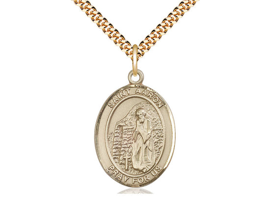 This elegant St. Aaron pendant is crafted in 14kt gold-filled material, featuring a beautifully detailed medal that measures 1 inch tall by 3/4 inch wide. It hangs on a 24-inch gold-plated heavy curb chain, offering both durability and style. A perfect blend of faith and fashion, this piece makes a meaningful and timeless addition to any collection.