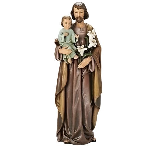 This statue of Saint Joseph tenderly carrying the Child Jesus and holding lilies captures both his purity and protective care. A timeless devotional piece, it reflects the quiet strength and faith of the foster father of Christ.