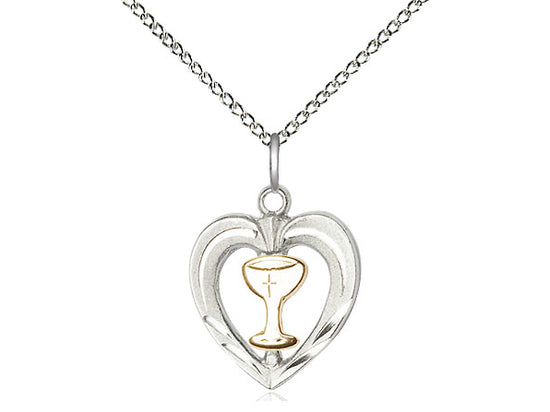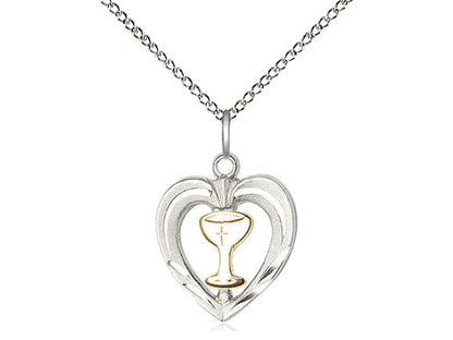 This 2-Tone Sterling Silver Heart / Chalice Pendant on an 18-inch Sterling Silver Light Curb Chain features a beautifully crafted heart and chalice design, symbolizing love and faith. The medal measures 3/4-inch tall by 5/8-inch wide, showcasing intricate detail in its two-tone finish. The 18-inch sterling silver light curb chain is elegant and durable, offering a classic look with a secure lobster claw clasp for ease of wear.