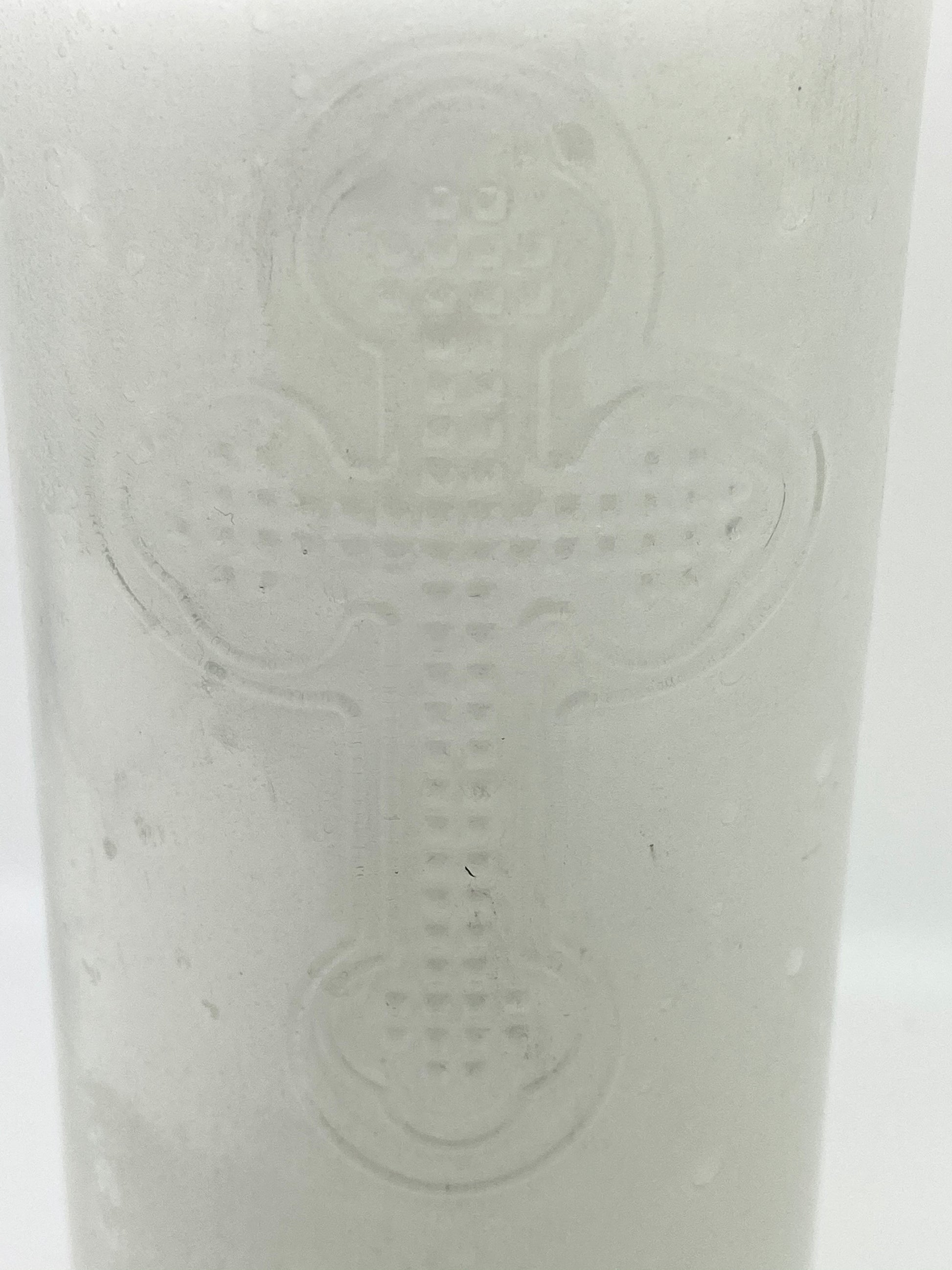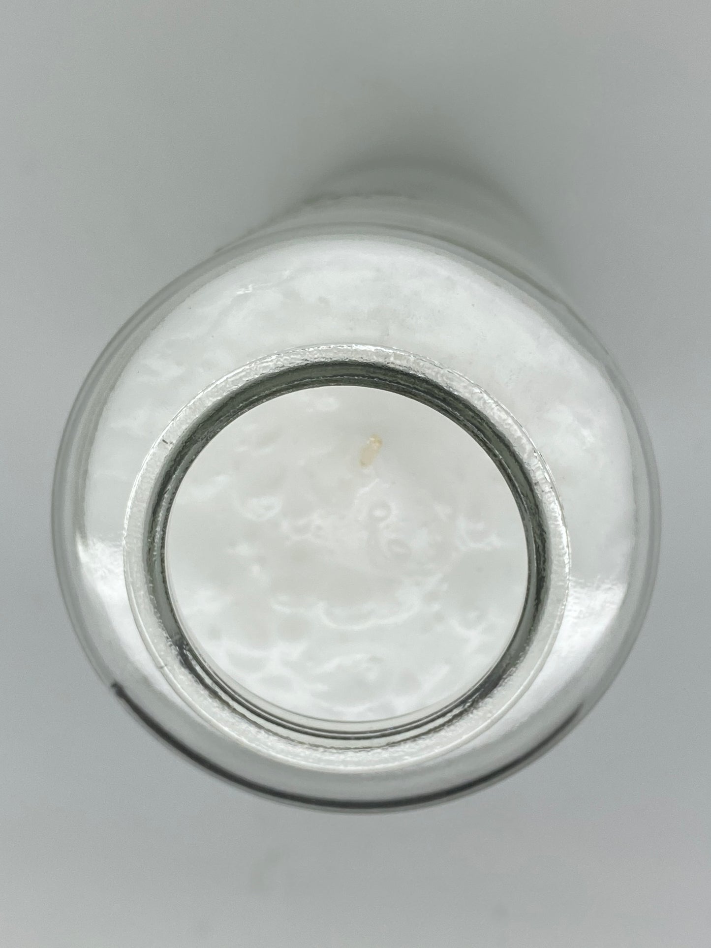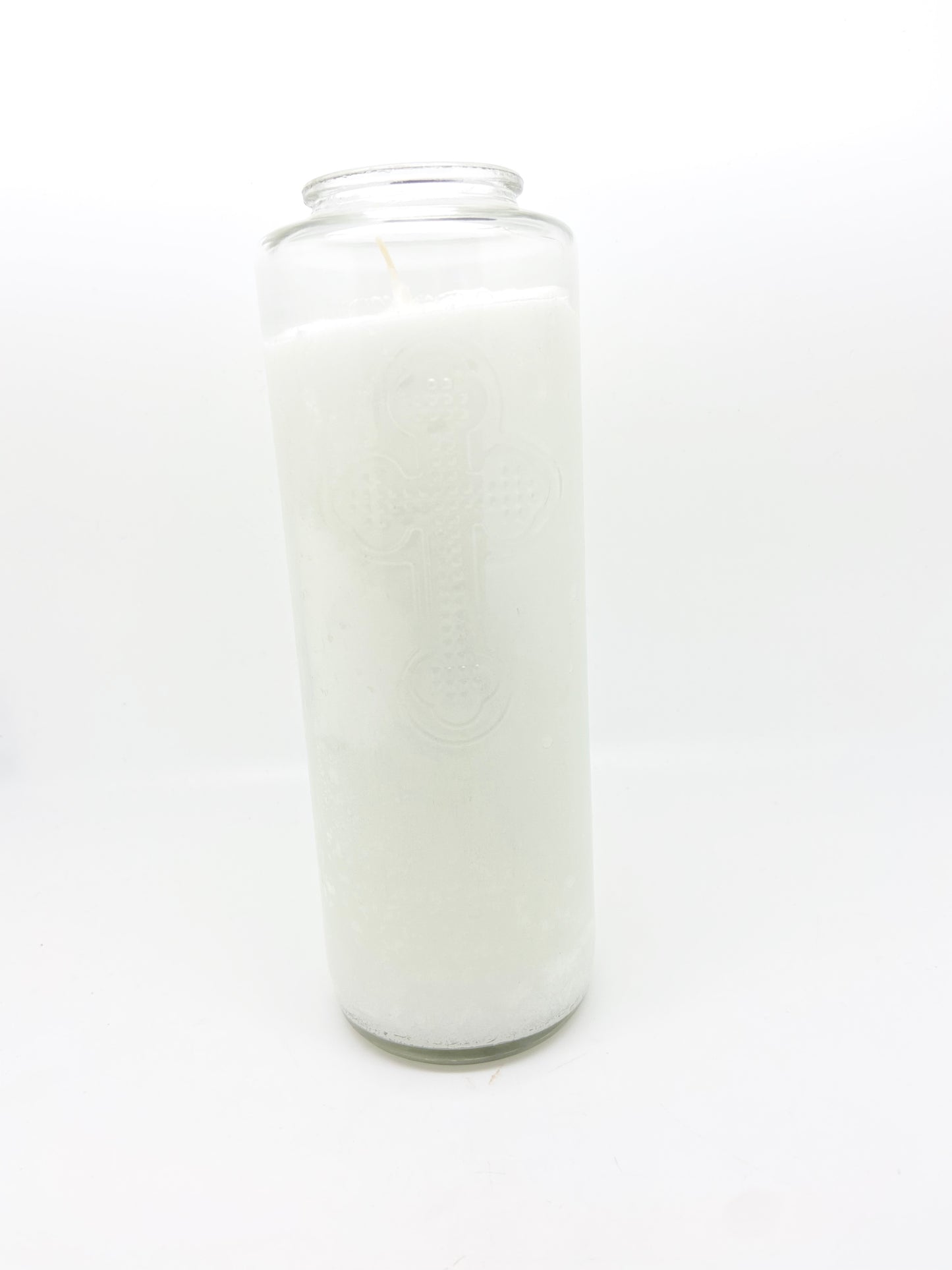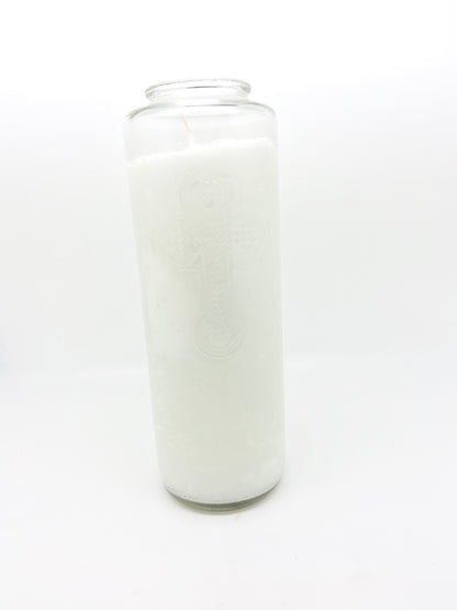 Glass-enclosed Sanctuary Candle designed to burn for full 8 days. 3 1/4" diameter, 8 Inches tall. Available in store only.