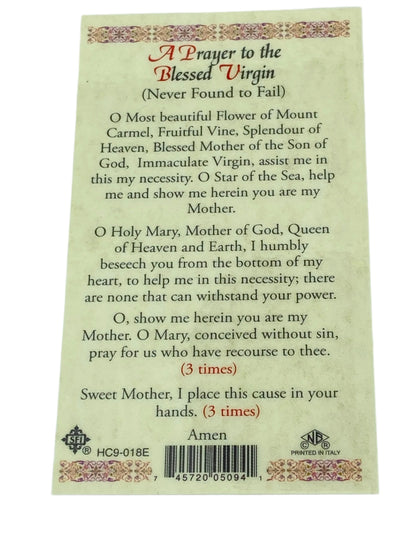 Cherish your devotion with this stunning laminated Holy Card featuring Our Lady of Mt. Carmel. The durable plastic covering protects a beautiful image paired with an inspiring prayer, making it perfect for daily spiritual reflection or as a meaningful gift for fellow believers.