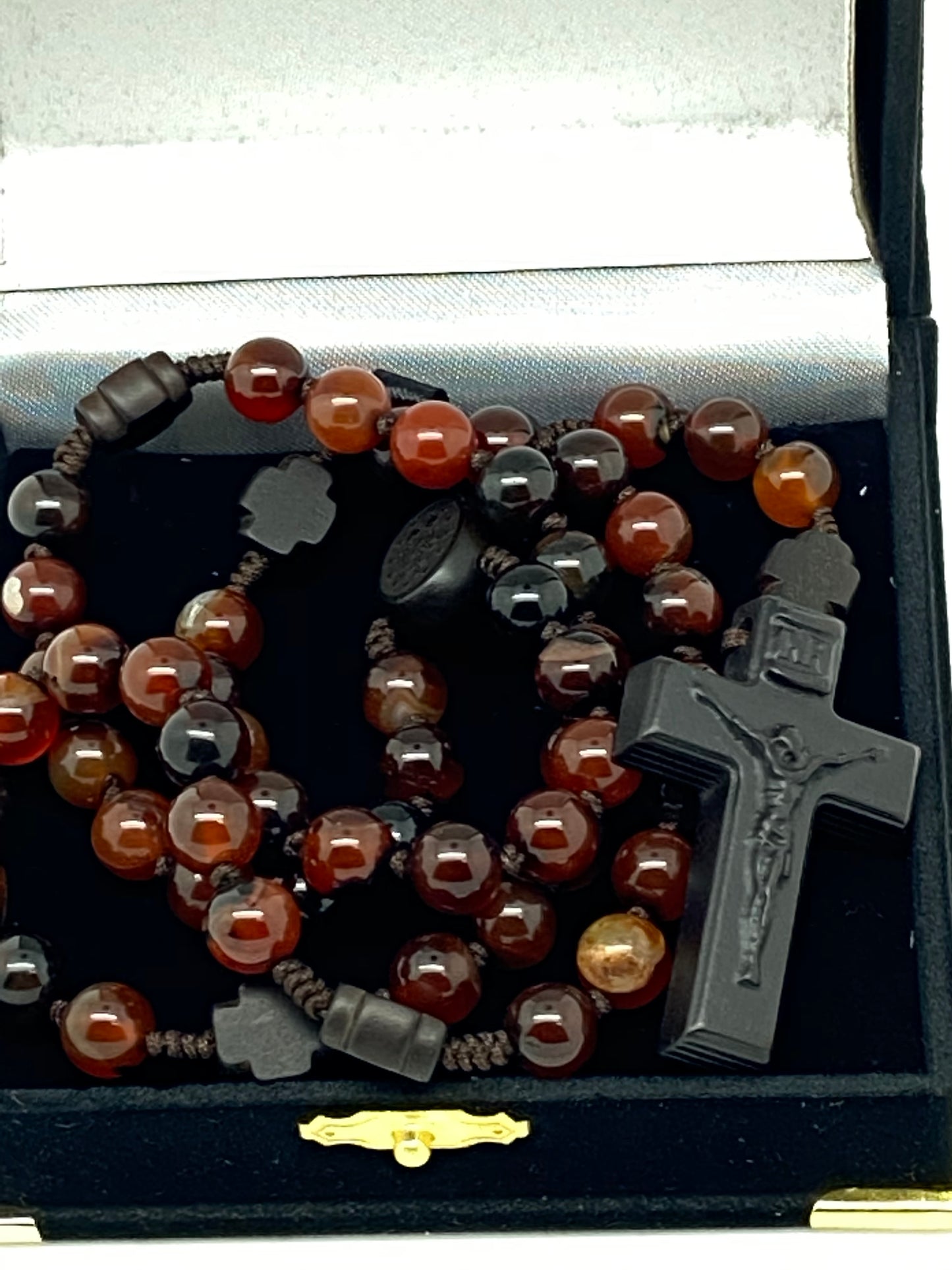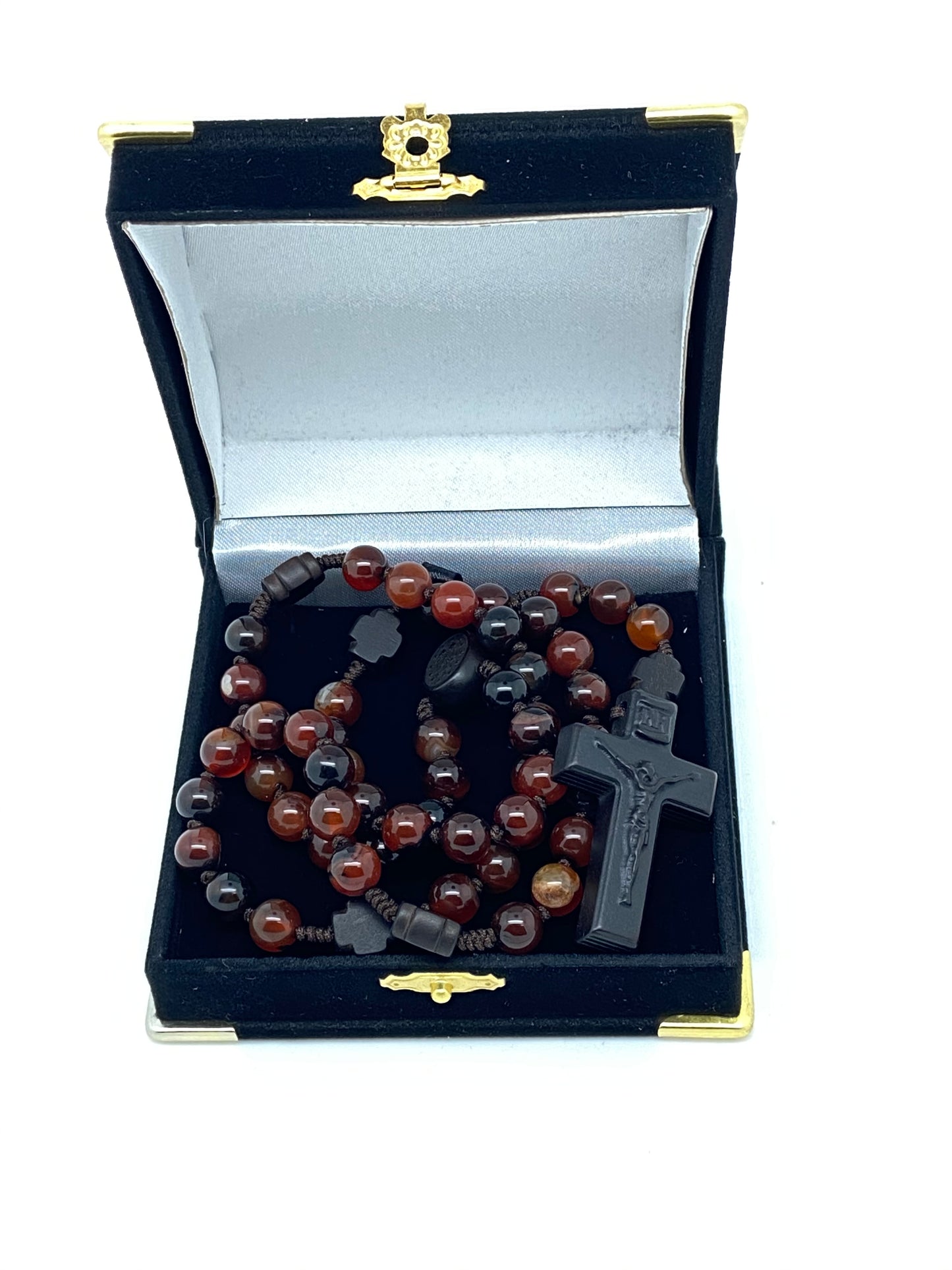 This Agate/Jujube Wood Rosary (8mm) features a durable, stringed design and comes packaged in a high-end black velvet gift box. The smooth, round gemstone beads are complemented by a finely crafted jujube wood crucifix and a double-sided, laser engraved centerpiece. Additionally, the "Our Father" beads are uniquely shaped like crosses. This rosary measures 17 inches in length and makes for a special and meaningful gift.