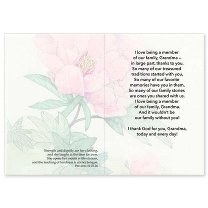 I love being a member of our family, Grandma — in large part, thanks to you. So many of our treasured traditions started with you, So many of our favorite memories have you in them, So many of our family stories are ones you shared with us. I love being a member of our family, Grandma. And it wouldn’t be our family without you! I thank God for you, Grandma, today and every day!Bible Verse: