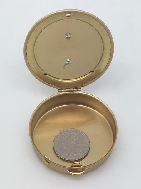 Medium size pyx with a pewter image of hands holding up the Bread and Wine before the cross.