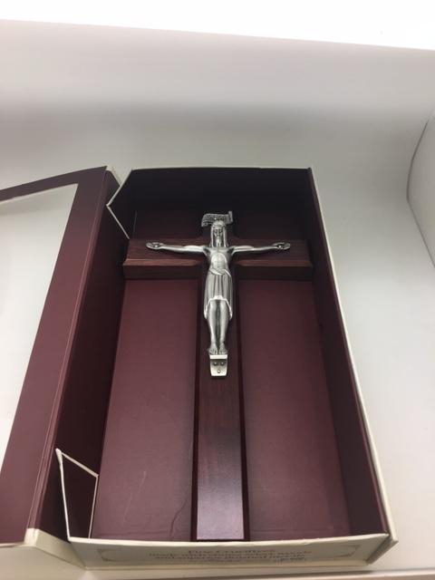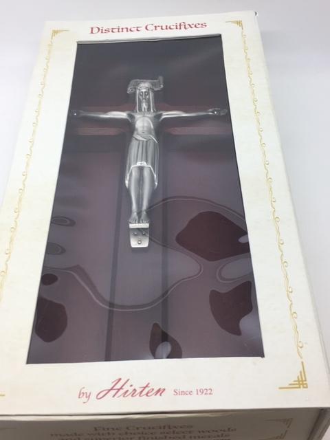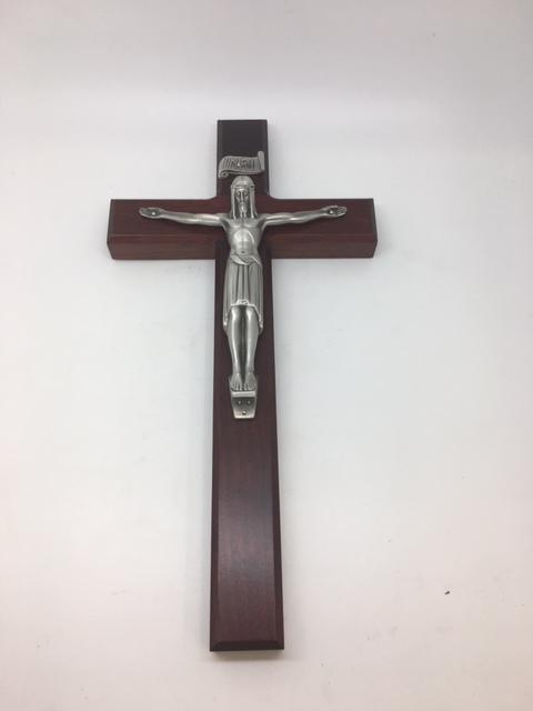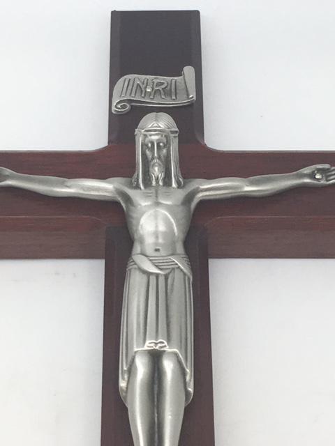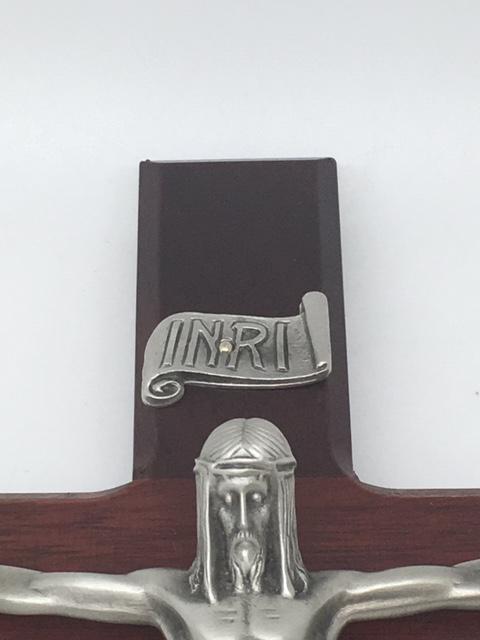 Genuine cherry wood crucifix with a finely designed pewter corpus. Elegant, strong crucifix, making a great gift for the office or the home. Great housewarming gift.
