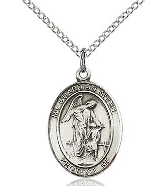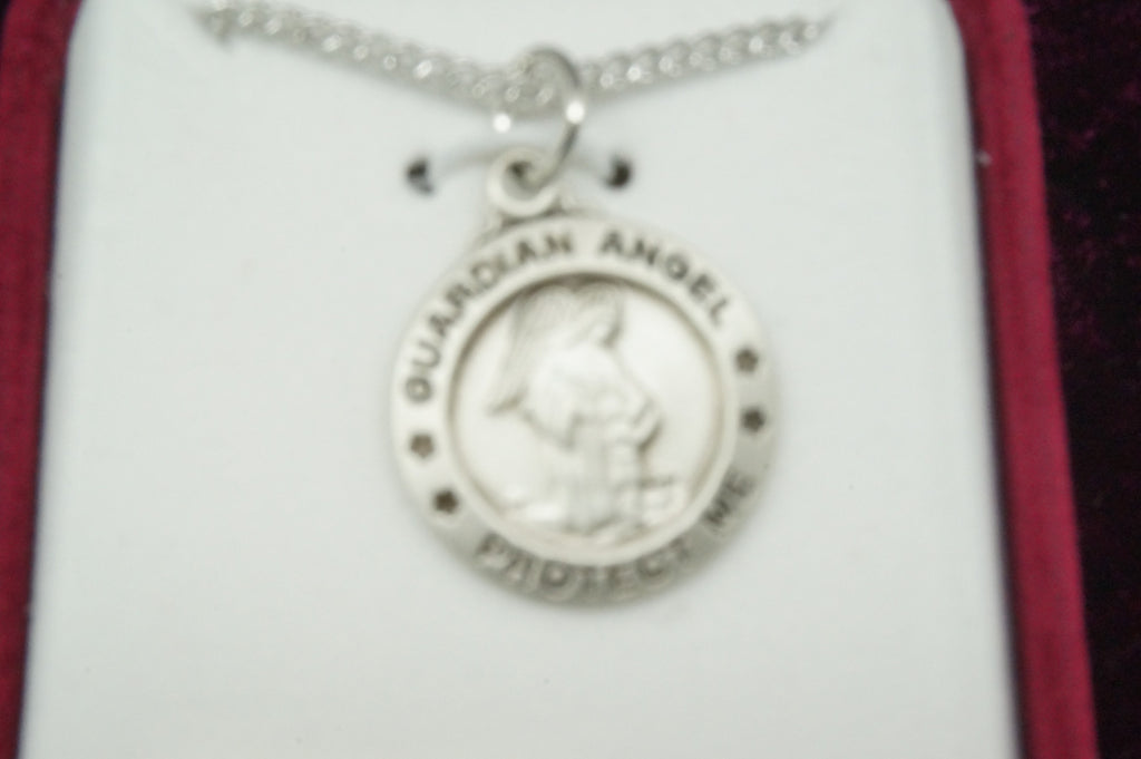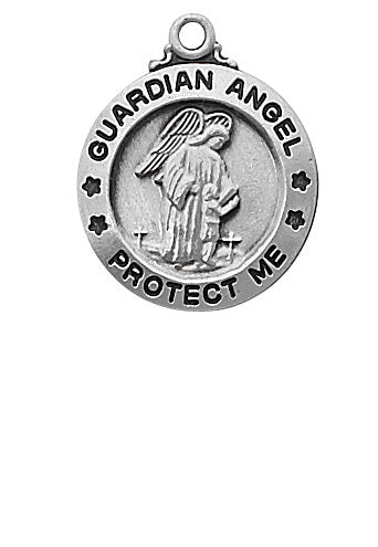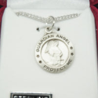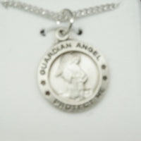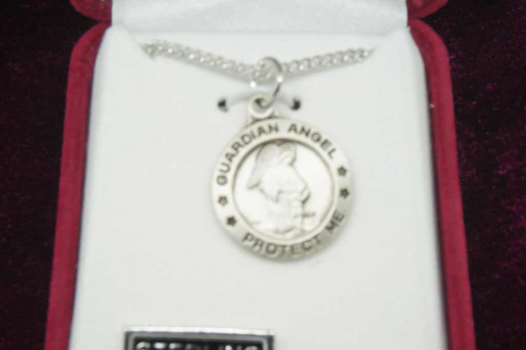 This 5/8" Sterling Silver Guardian Angel Medal is crafted with the highest quality and comes with a limited lifetime warranty. It is accompanied by an 18" Rhodium Chain, each made in the USA. Packaged in a deluxe box, this product is a must-have for those seeking beauty and durability.