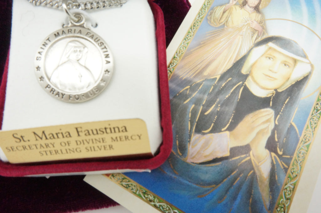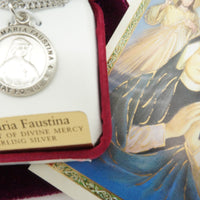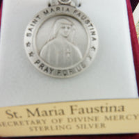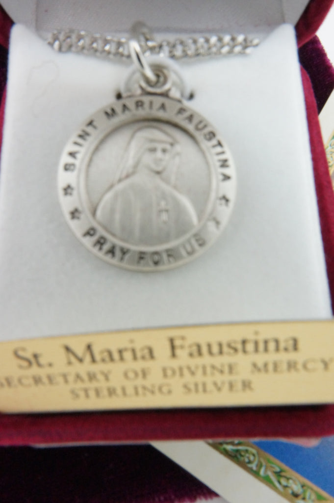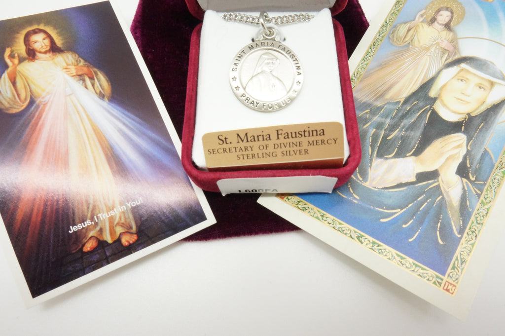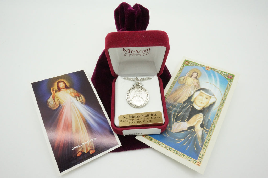 The new 3/4" Silver (925 Silver) Saint Faustina Medal with chain includes a 20" chain, original velvet box, St. Faustina Prayer Card, Divine Mercy Prayer Card, and elegant wine velvet Gift Bag. It also comes with a limited lifetime warranty for quality and is packaged in a deluxe box.