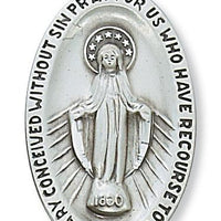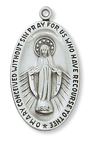 Experience the wonder of the Sterling Silver Miraculous Medal with its accompanying rhodium-plated chain and deluxe gift box. Measuring at 1 1/2" x 7/8", it is the perfect addition to your collection.