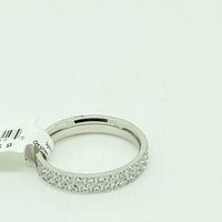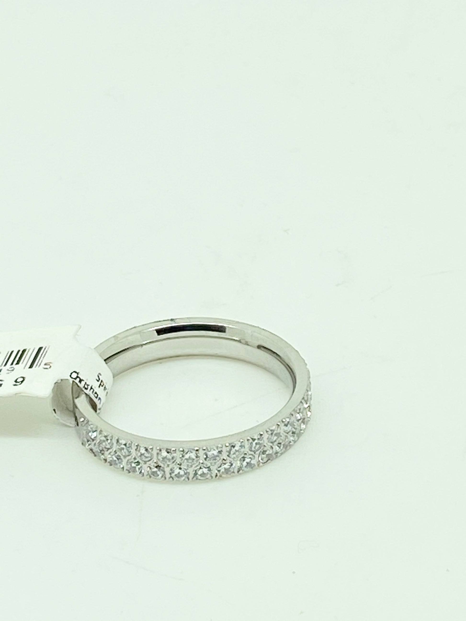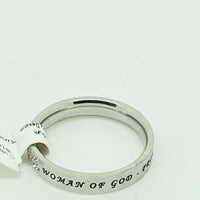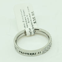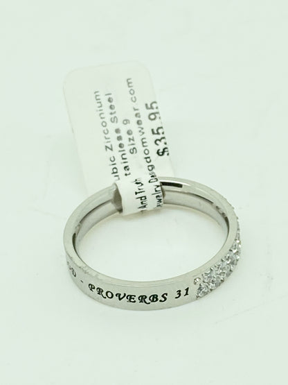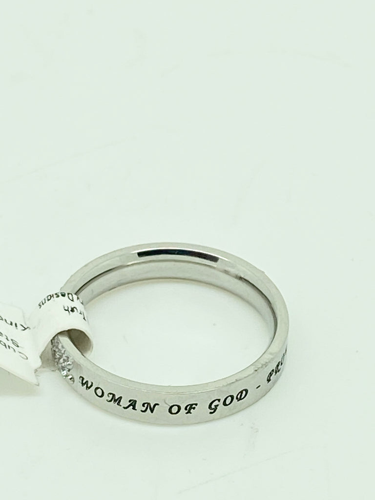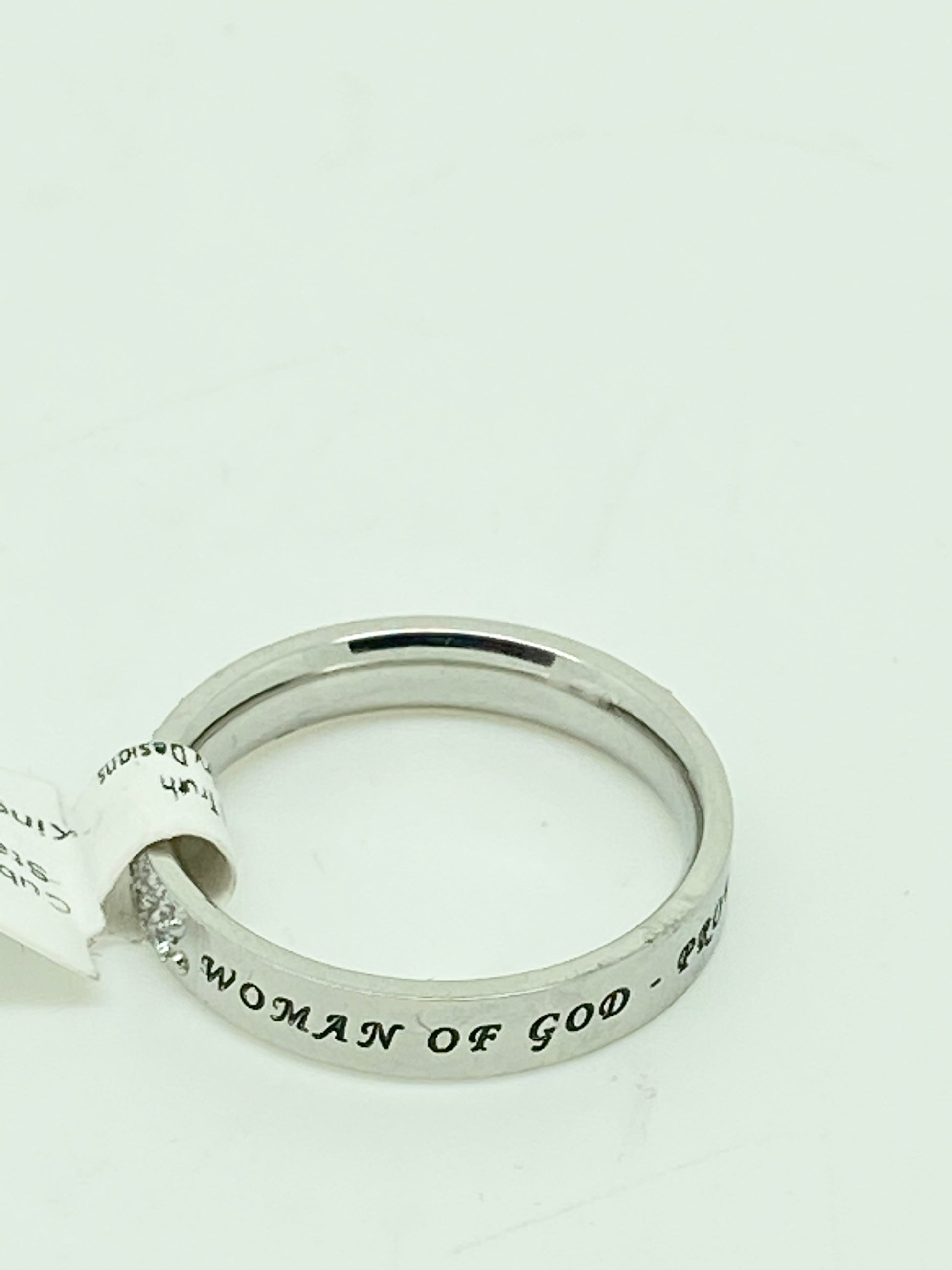 Stainless steel ring with a band of Cubic Zirconias. Engraving reads Woman of God-Prov 31
