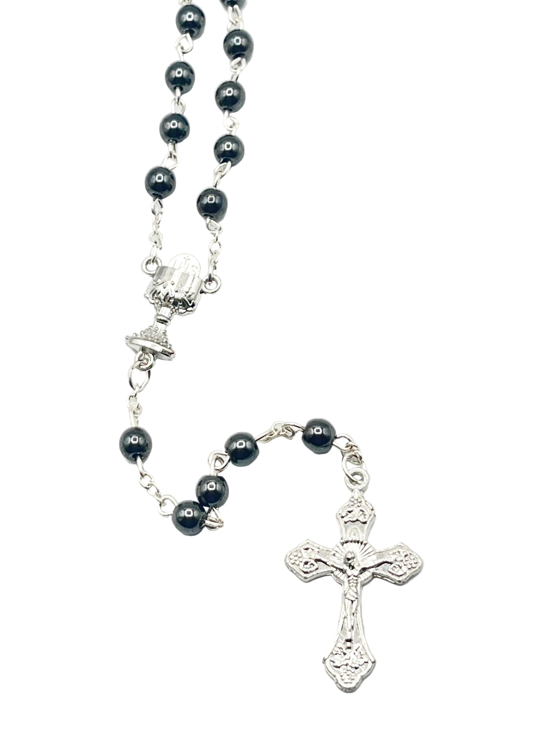 First Communion Hematite Rosary with Chalice Centerpiece 6mm