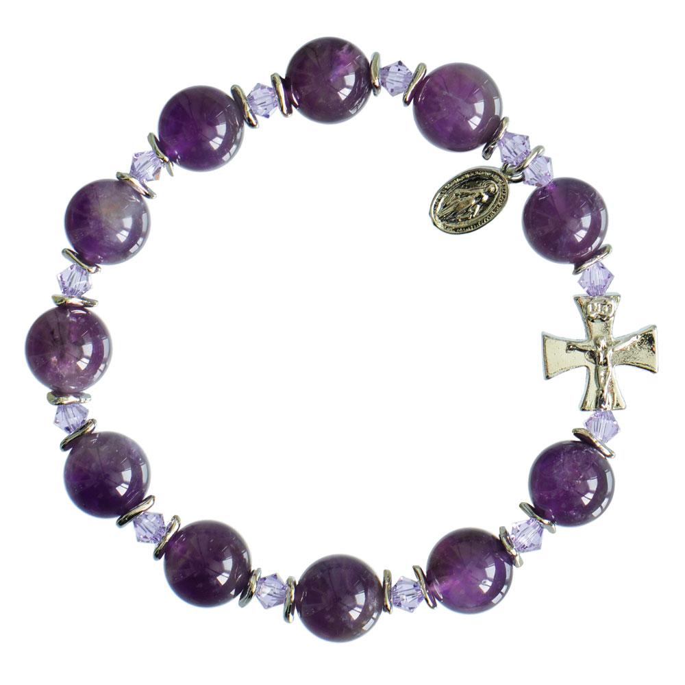 This Genuine Amethyst Rosary Bracelet (10mm) features sturdy and durable stretch construction with smooth, round genuine gemstone beads. It also includes Swarovski crystal spacers for additional embellishment. The pewter crucifix is adorned with zirconium crystals and there is a dangling Miraculous Medal on the bracelet, making it a beautiful piece. The bracelet has a 2.25" circumference and comes in a deluxe black velvet gift box, perfect for gifting.
