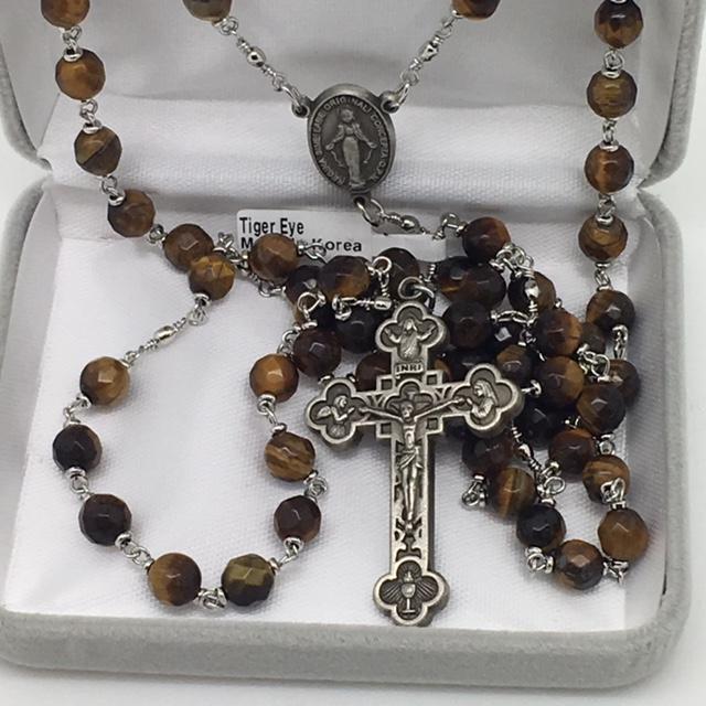 This genuine Tiger Eye Rosary (6mm) boasts beautifully faceted beads and strong links, making it durable and long-lasting. The pewter Crucifix, centerpiece, and links have a rhodium finish to keep them from tarnishing. It comes in a luxurious velour gift box, making it a perfect present. Measuring at 22 inches in length, this rosary is a stunning and meaningful addition to any collection.