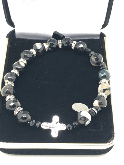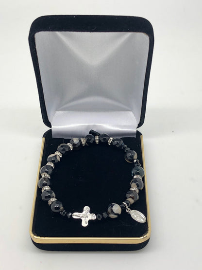 This Genuine Zebra Jasper Rosary Bracelet boasts a sturdy and durable stretch construction, complete with smooth round gemstone beads that are genuine and authentic. To add a touch of elegance, the bracelet features a pewter Crucifix adorned with sparkling zirconium crystals, as well as a dangling pewter Miraculous Medal. With a 2" diameter, this bracelet is perfect for daily wear and serves as a beautiful reminder of your faith.