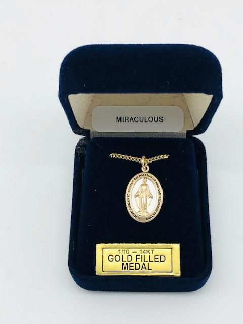 This Gold Filled Miraculous Medal Pendant (3/4") comes with an 18-inch chain and measures 3/4" in height and 3/8" in width. The chain is a Gold Plate Light Curb Chain with a Lobster Claw Clasp.