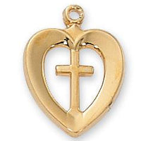 This Gold over Sterling Silver Heart and Cross measures 5/8" and comes with a Rhodium plated 18" chain and deluxe box.
