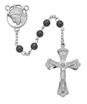 Hematite beads with a Benedictine medal centerpiece. Silver Benedictine Crucifix. Great gift idea for him. Strong bold and striking in appearance. Great Father's day gift idea. Comes in a deluxe red velvet gift box.