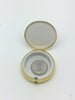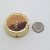 Attractive gold Pyx with enameled Chalice and Host on the front. It is approximately 2 inches around and just under 1/2" deep.