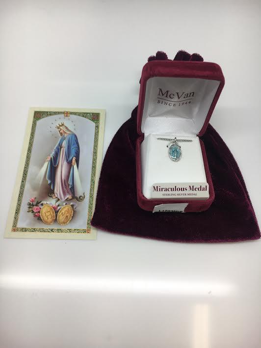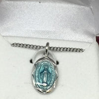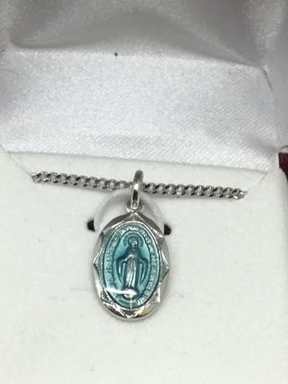 Sterling Silver and Blue Enamel Miraculous Medal on  a 16" Rhodium plated chain. Comes in a deluxe red velvet gift box.