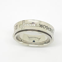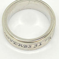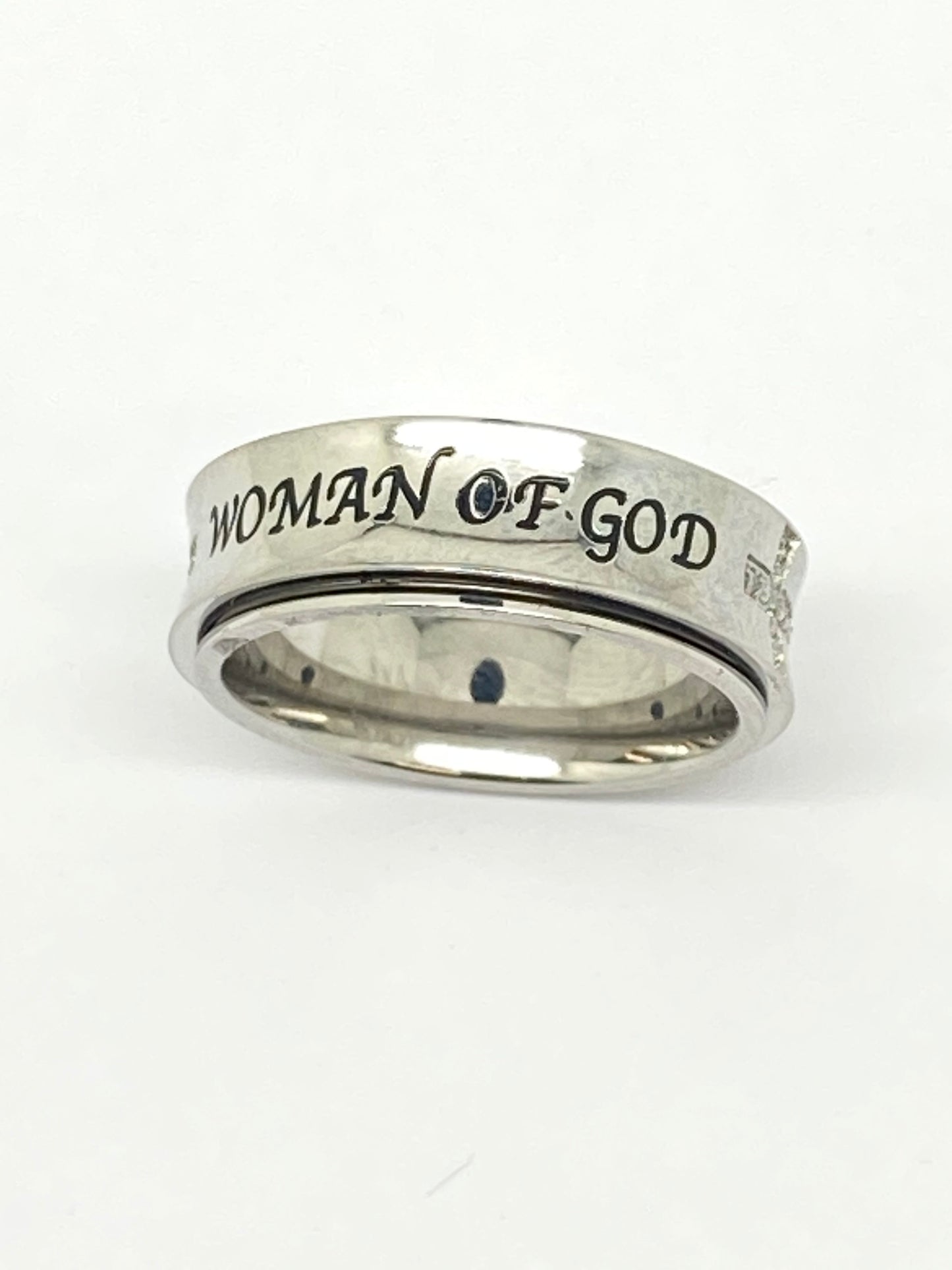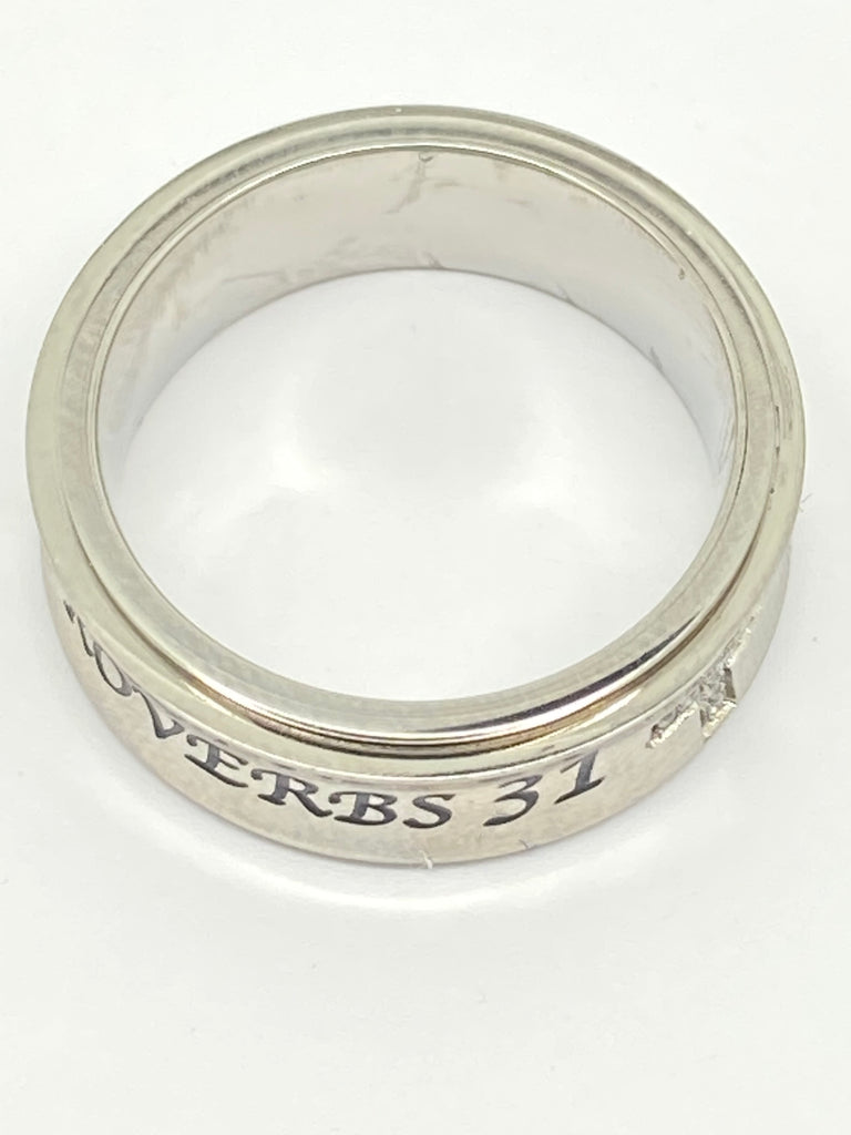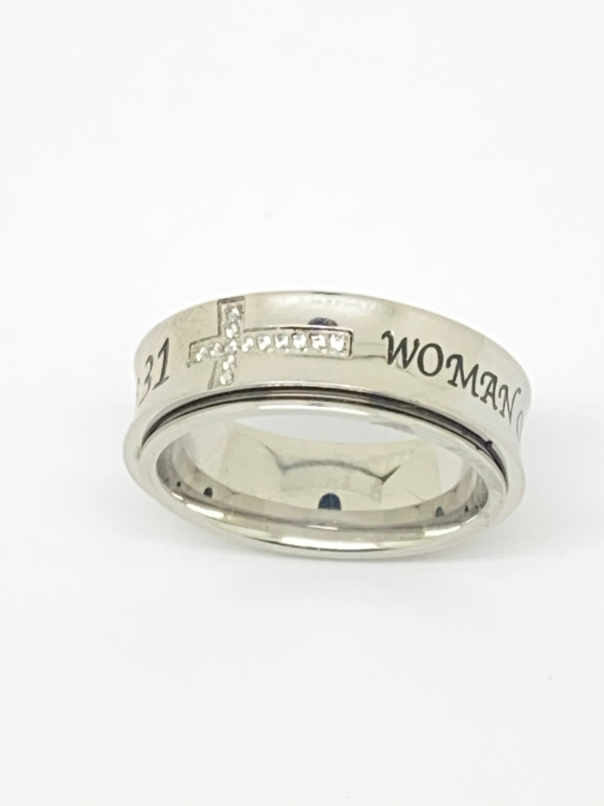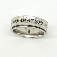 Stainless steel silver spinner ring. The outside is engraved with Woman of God Prov: 31 scripture is electro plated into the ring. Heavy Duty and ultra high quality version spinner ring.