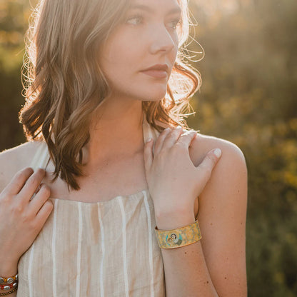 • Epoxy printed gold-tone plated cuff. 1" height, 2.4" x 1.75" interior dimension