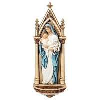 This elegant holy water font features the Blessed Mother tenderly holding the Infant Jesus, a touching reminder of love, faith, and protection. Both devotional and decorative, it serves as a meaningful addition to any home.