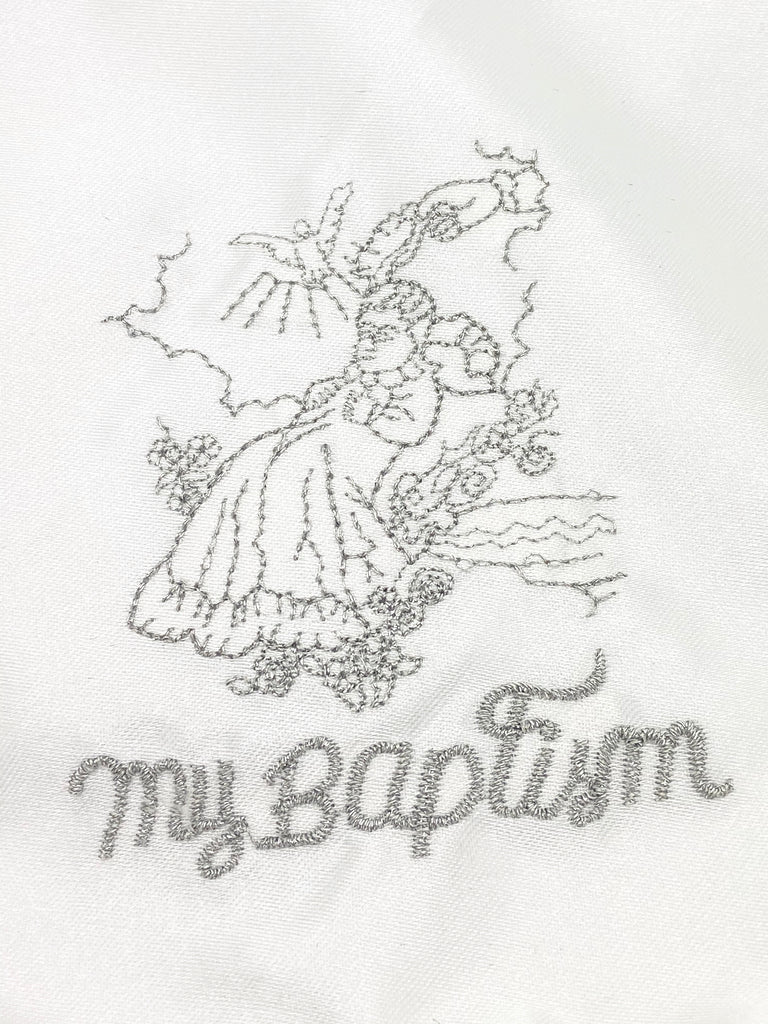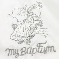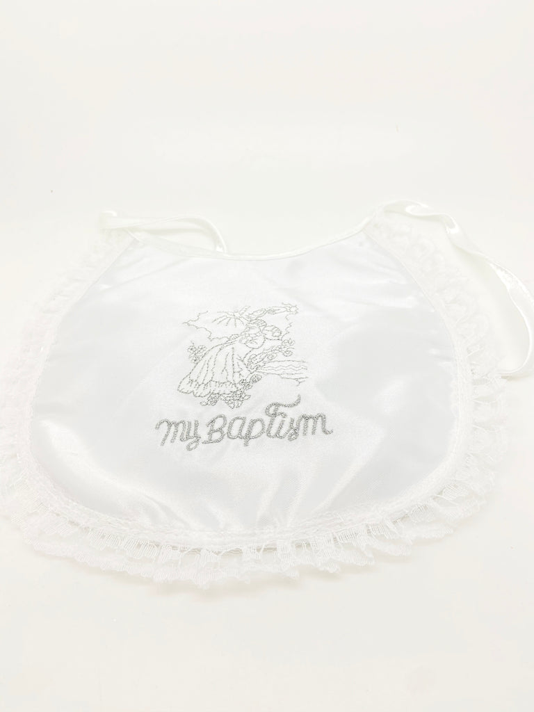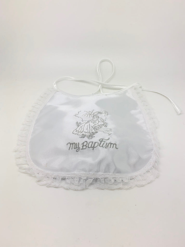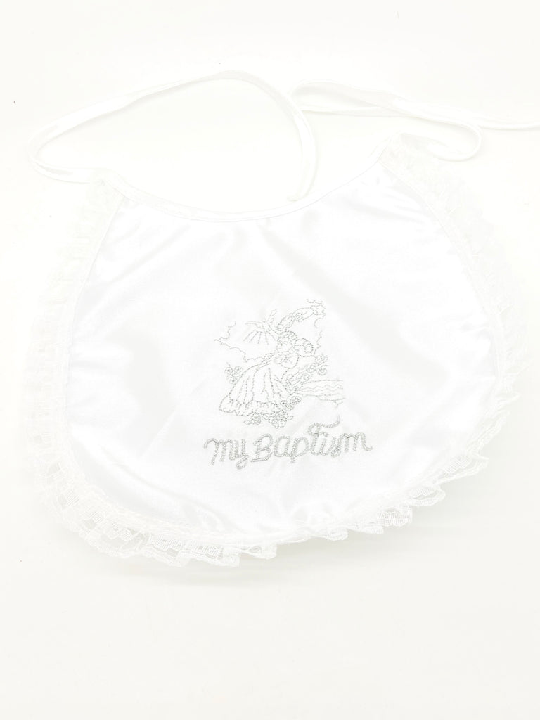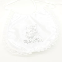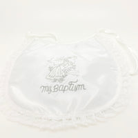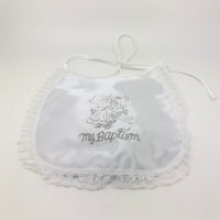 Elegant baptism bib. The words "My Baptism are surrounded by a Lacey baby image. Laced Edges. All white and ready for that special day.