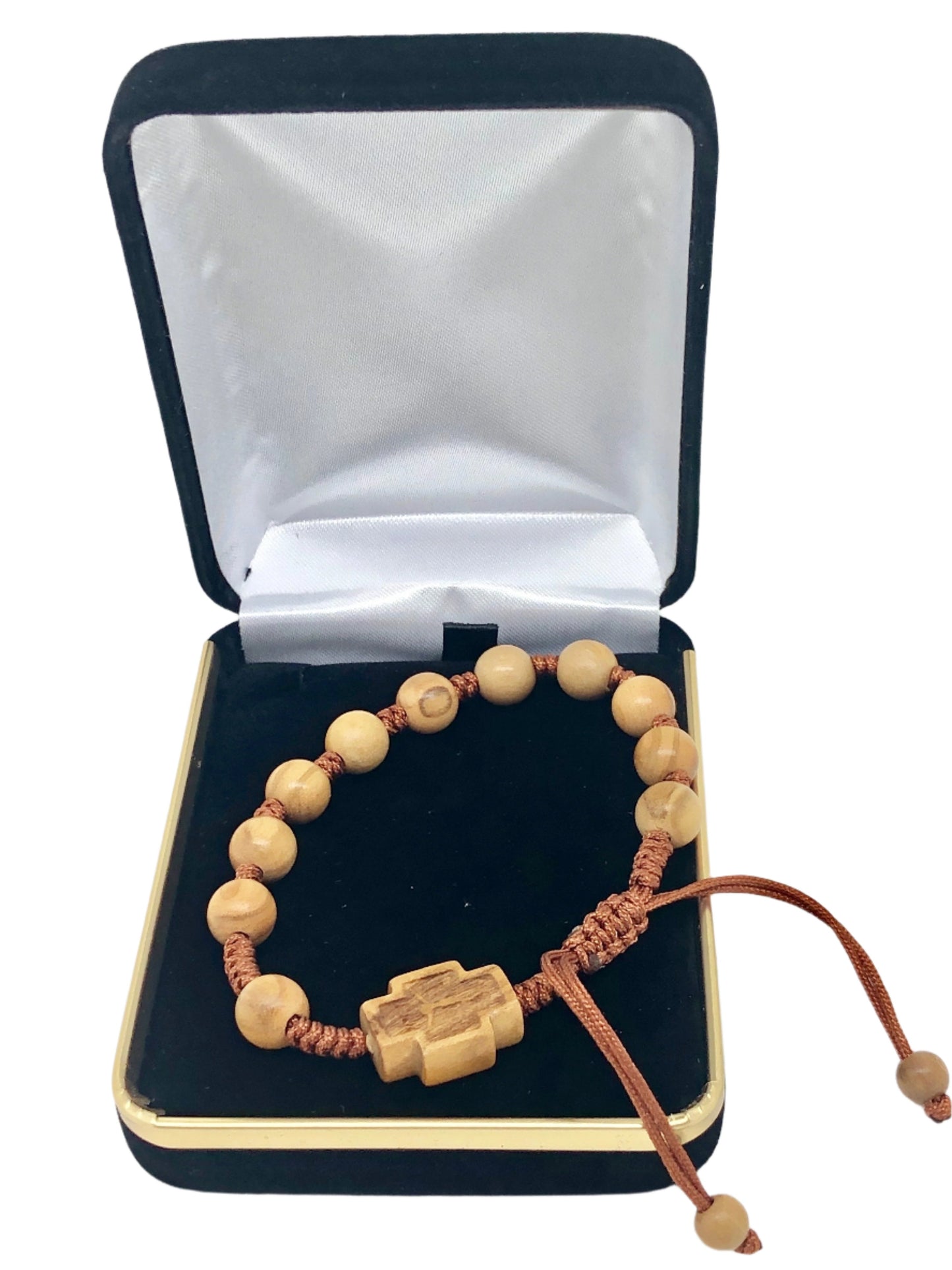 The Olive Wood Rosary Bracelet (8 MM) features a striking brown color and is crafted with an adjustable cord for durability and convenience. The 8 mm beads and laser engraved crucifix add a smooth and polished touch. This versatile accessory is suitable for both men and women and comes packaged in a deluxe black velvet gift box.