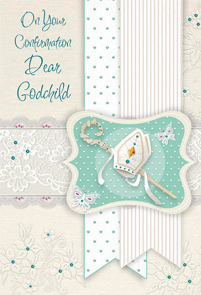 Inside says: May God's blessings be upon you, as you take this important step of faith. May this Confirmation Day be filled with memories you, to cherish forever. God Bless You Godson! 2 Corinthians 9:8