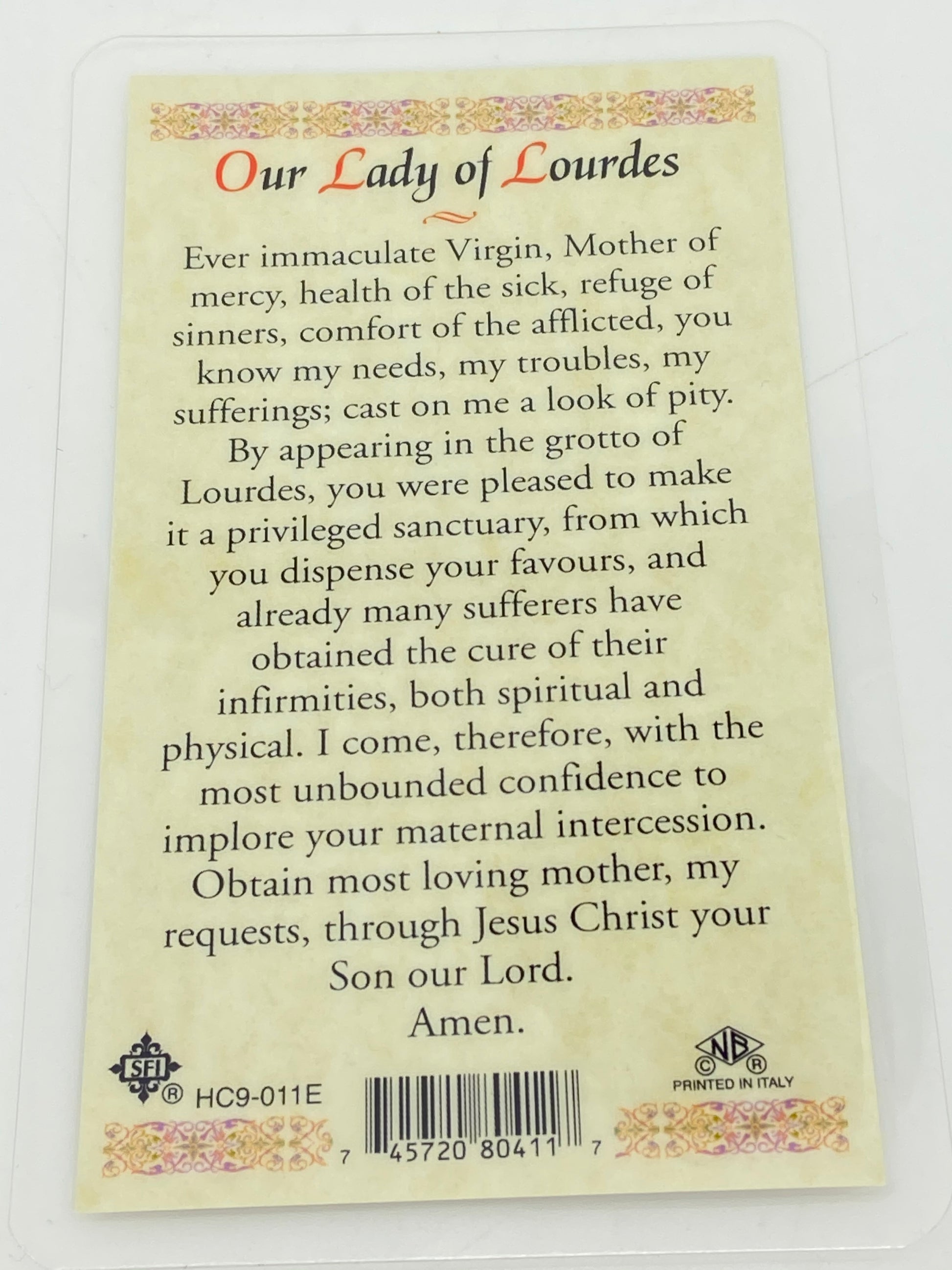 Cherish a timeless devotion with this stunning laminated holy card featuring Our Lady of Lourdes and Saint Bernadette. The durable plastic covering protects the sacred image while the included prayer invites daily spiritual connection. Perfect for your home altar, wallet, or as a meaningful gift for any Catholic faithful.