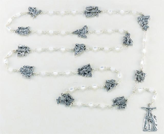 6 x 9mm Oval Faux Mother of Pearl Bead Rosary with 14 Ornate Silver Oxidized Medals and Crucifix. 27"