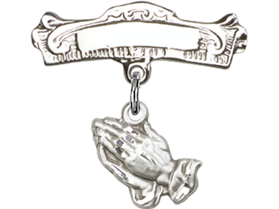 This sterling silver baby badge features a delicate "Praying Hands" charm, symbolizing faith and blessings. The polished, arched badge pin adds a timeless, elegant touch, making it a perfect keepsake for special occasions like baptisms or christenings. Crafted from high-quality sterling silver, it offers both beauty and durability.