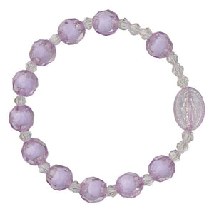 This elegant Purple Acrylic Children's Rosary Bracelet (8mm) features a sturdy and durable stretch construction, with smooth round faceted acrylic beads and a Miraculous Medal centerpiece. It has a 1.75" circumference and comes in a deluxe black velvet gift box.