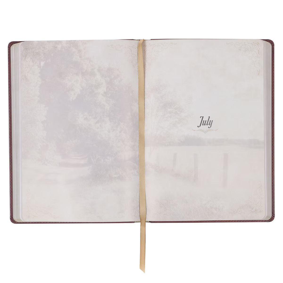 The devotional features an elegant yet simple cover design, which includes a heat-debossed frame with corner scrolls and a stylish gold-foiled title.