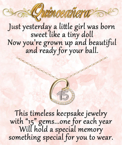 Sterling silver Quinceanera necklace for girls with a stunning heart pendant is part of our Timeless Collection.  This charm is special and represents her 15 years with a stone for each year on the pendant.  This is designed with sterling silver base with 14K gold-plating and a sterling silver "15".  This pendant floats on a 16-18 inch adjustable Italian wheat chain so you can adjust it to the perfect length.  High quality keepsake necklace comes with a sweet poem and special gift box to save her timeless gift.
