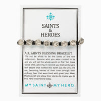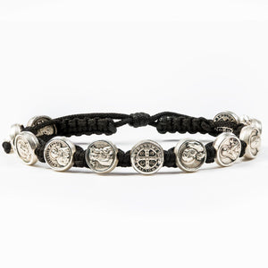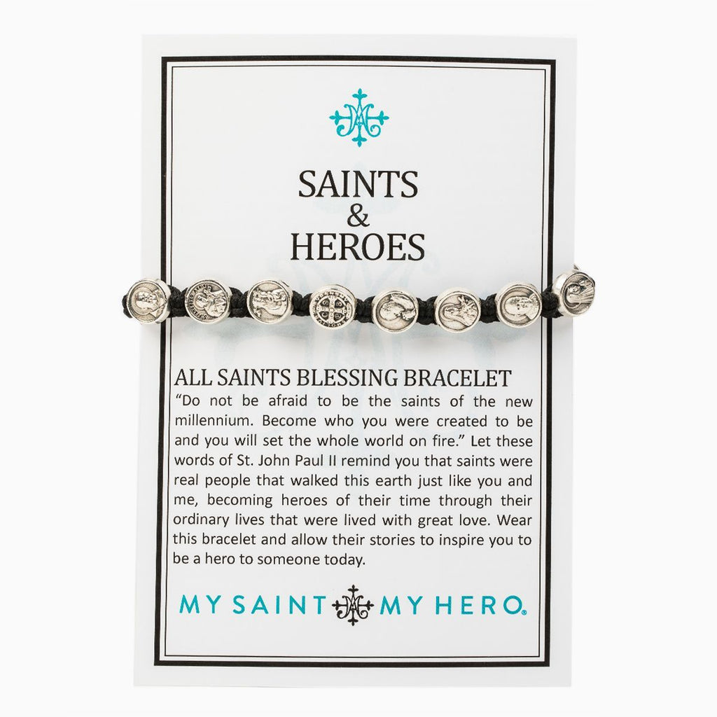 Handwoven in Medjugorje, Bosnia and Herzegovina. Saints & Heroes All Saints Blessing Bracelet features 10 silver tone Benedictine medals and our signature "blessed" tag. Medals made in Italy. This bracelet comes on woven cording with a sliding slipknot for an easy fit. 9.5" when fully opened. Saints & Heroes All Saints Bracelet comes on an inspirational card.