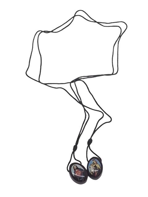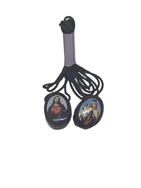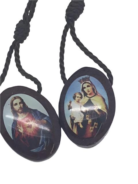 Small wood scapular with the sacred heart of Jesus on one and the Our Lady of Mount Carmel and Child on the other.