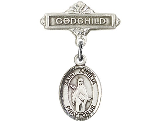 This elegant Sterling Silver Baby Badge features a St. Amelia charm, beautifully designed to honor the patron saint of arm pain and bruises. Paired with a Godchild Badge Pin, it makes a heartfelt and meaningful gift for baptisms, christenings, or special occasions. Crafted with timeless quality, it serves as a cherished keepsake for your loved one.