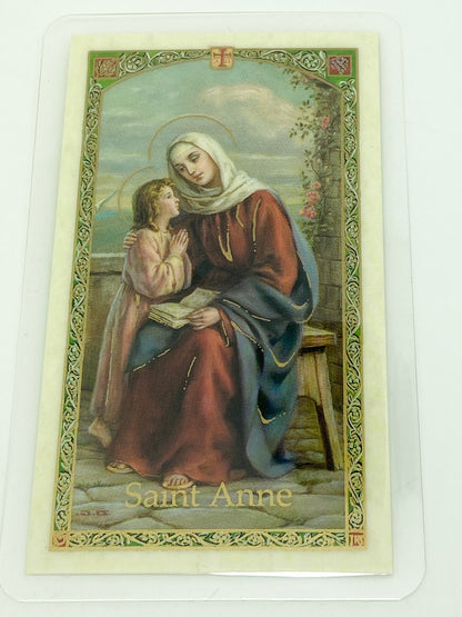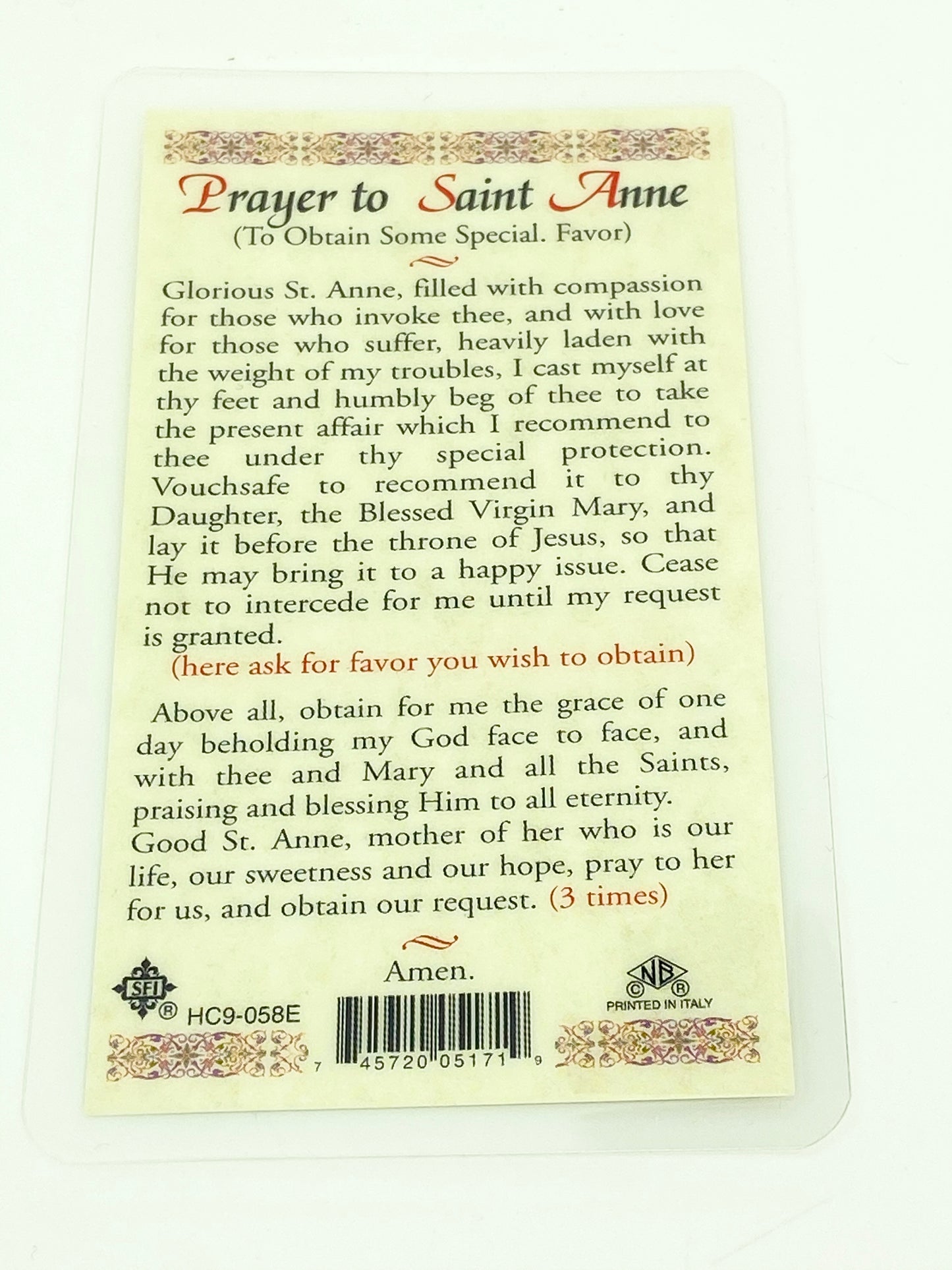 Cherish a timeless devotion with this exquisite laminated Holy Card featuring St. Anne. Protected by durable plastic covering, this sacred keepsake combines a reverent image with an inspiring prayer, perfect for daily spiritual reflection or as a meaningful gift for the faithful.