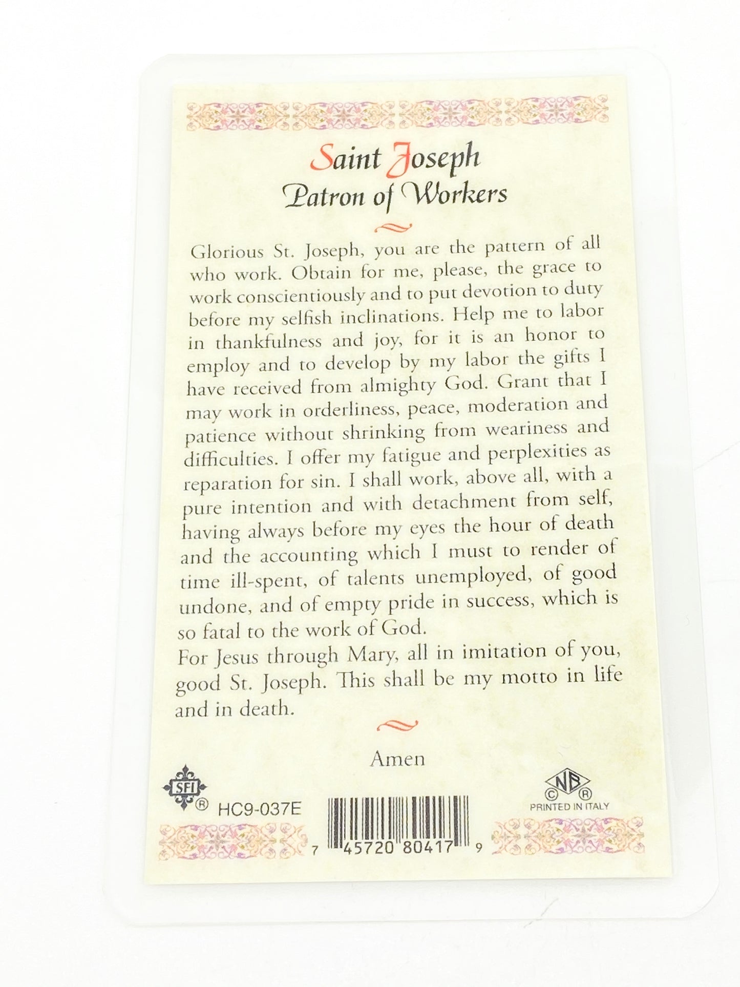St. Joseph Patron Saint of Workers Laminated Holy Card (Plastic Covered)