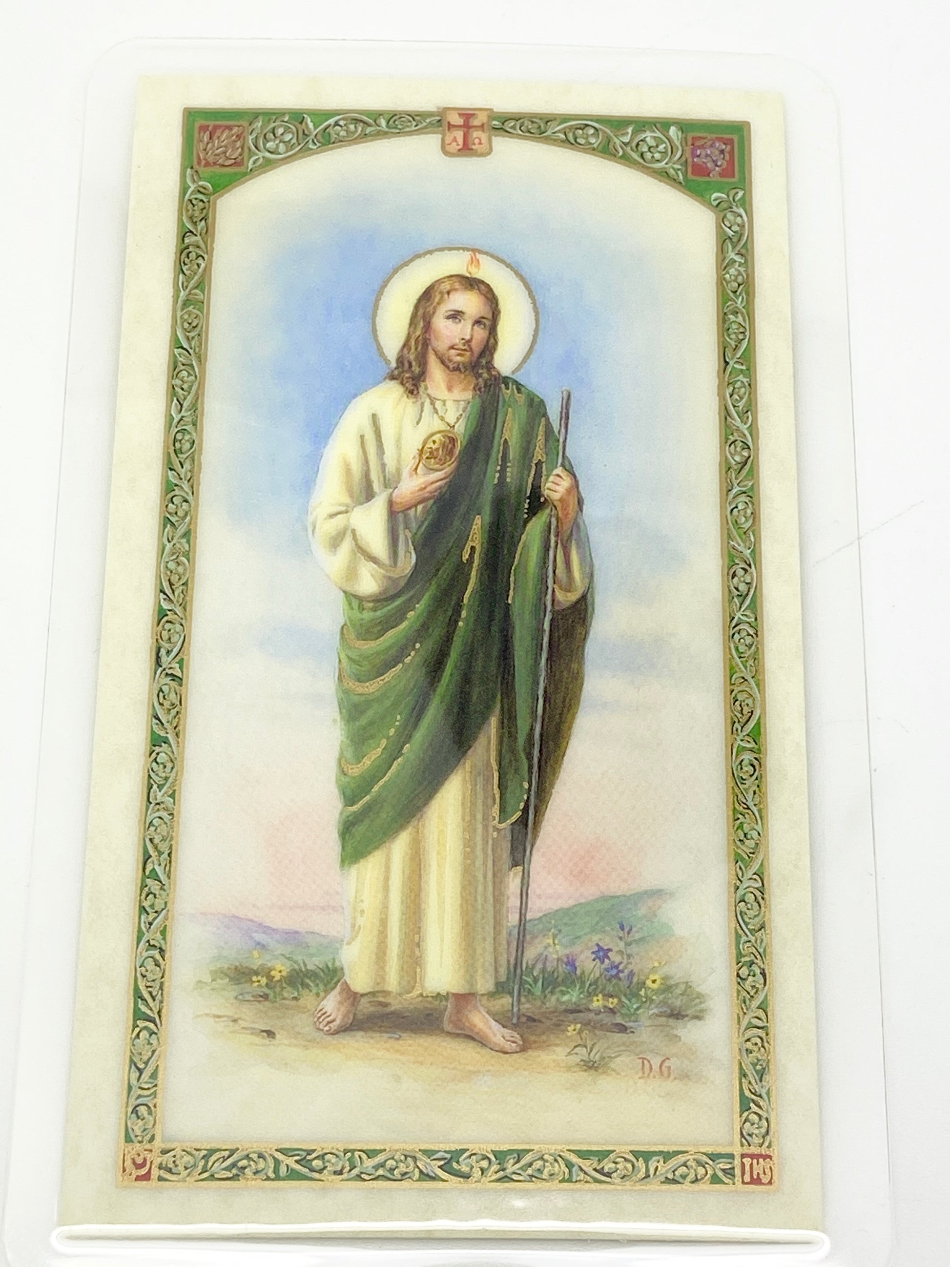 Carry the comfort of St. Jude's intercession wherever you go with this durable laminated holy card. Featuring a striking image paired with a powerful thanksgiving novena prayer, this plastic-protected card is designed to inspire devotion and provide spiritual guidance through life's challenges. Perfect for daily reflection or as a meaningful gift for those seeking St. Jude's patronage.