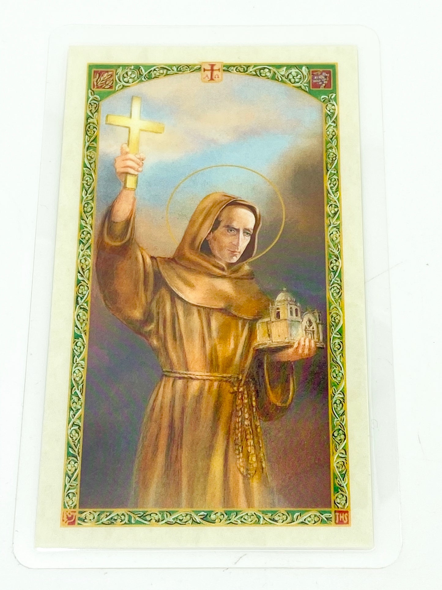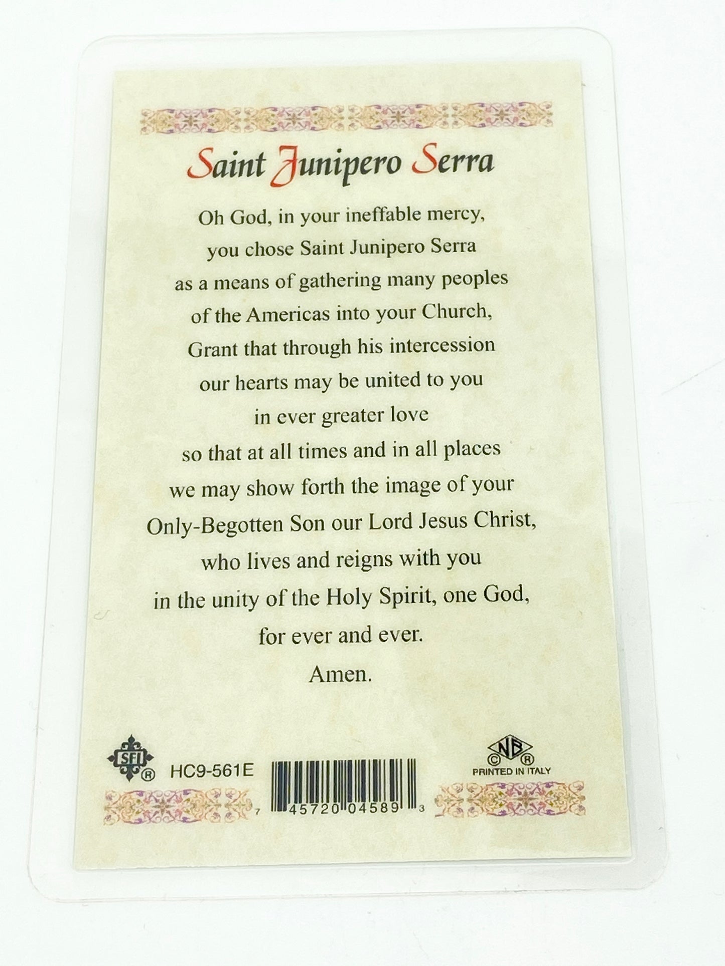 Carry the spiritual inspiration of St. Junipero Serra (Patron Saint of Missions and Califonia) with you wherever you go. This durable laminated holy card features a striking image paired with a meaningful prayer, making it perfect for daily devotion, gifting, or displaying in your home. The protective plastic coating ensures it withstands everyday use while keeping your saint's image vibrant and pristine.
