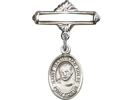 This sterling silver baby badge features a St. Maximilian Kolbe charm, the Patron Saint of Charity and Drug Abuse. The polished pin serves as a symbol of love, compassion, and selfless service, making it a meaningful gift for anyone dedicated to helping others. Crafted from high-quality sterling silver, this badge is a lasting reminder of the saint's inspiring legacy.