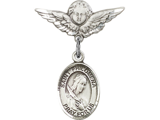 This St. Philomena Sterling Silver Baby Badge features a delicate charm of St. Philomena, the Patron Saint of Children, paired with an angel with wings badge pin. Crafted from high-quality sterling silver, this badge serves as a thoughtful gift, offering spiritual protection and blessings. It's a meaningful keepsake for babies and children, providing a symbol of faith and safety.