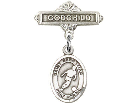This sterling silver baby badge features a delicate St. Sebastian and soccer charm, making it a perfect gift for a young godchild. St. Sebastian, the patron saint of athletes, symbolizes strength and perseverance, while the soccer charm adds a personal touch for those passionate about the sport. The pin is a timeless keepsake, combining faith and sports in a beautiful, meaningful way.