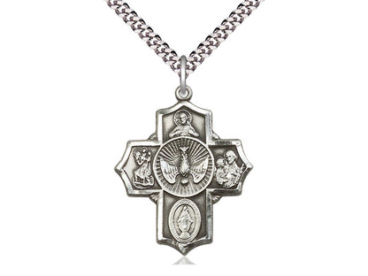 This stunning sterling silver 5-way pendant features a 1 1/4-inch by 1-inch medal adorned with five sacred symbols of faith, representing key figures and elements of devotion. Suspended from a 24-inch endless light rhodium-plated heavy curb chain, this piece blends spiritual significance with elegant craftsmanship, making it a meaningful accessory for those who cherish their faith. Its sleek, durable design ensures it can be worn daily while carrying a deep, timeless message.