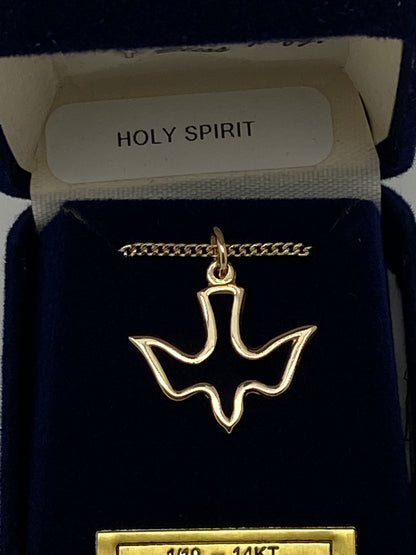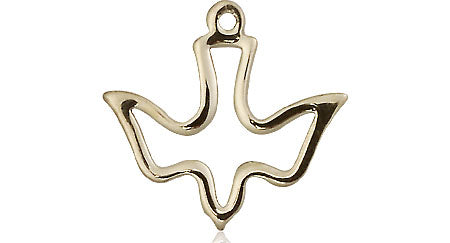Introducing the 14kt Gold Holy Spirit Medal, a symbol of divinity and grace. Measuring 5/8 inches tall and 3/4 inches wide, this medal is a perfect reminder of one's faith. Complete with an 18 inch chain, it is a timeless piece to be cherished for years to come.